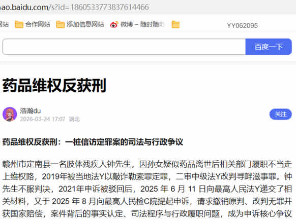赣州市定南县一名肢体残疾人钟先生,因孙女疑似药品离世后相关部门履职不当走上维权路,2019年被当地法Y以敲诈勒索罪定罪,二审中级法Y改判寻衅滋事罪。钟先生不服判决,2021年申诉被驳回后,2025 年 6 月 11 日向最高人民法Y递交了相关材料,又于 2025 年 8 月向最高人民检C院提起申诉,请求撤销原判、改判无罪并获国家赔偿,案件背后的事实认定、司法程序与行政履职问题,成为申诉核心争议点。